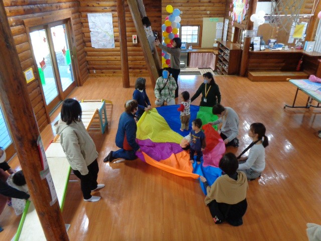 パラバルーンや手遊びが盛り込まれて、終始、和やかな雰囲気でおこなわれ、こどもたちは興味津々な様子で参加していました。