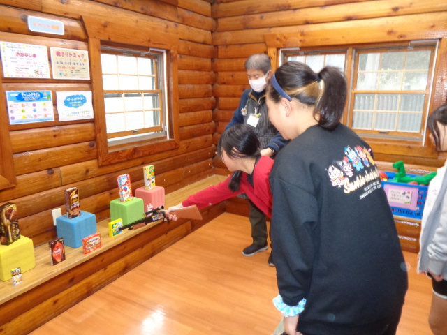 幼児さんと保護者が多く小学生が少なかったです。ログハウス内でこども達は4つの遊びを行い昨年より充実した景品を受け取り楽しんでいました。